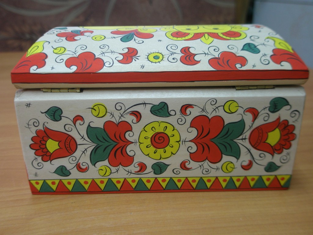 Здравствуйте,мои ПЧ!Сегодня хочу показать свою последнюю работу.Это сундучок с моей любимой Северо-двинской росписью.На передней стенке изображена райская птица.Её рисовали как пожелание райской жизни.С боков нарисован солярный знак-знак Солнца.А на крышке изображён красавец ЛЕВ.В старину его рисовали на крышках сундуков,ларцов,на дверцах шкафов,его считали хранителем,охранником.Мне он очень нравиться.А вам?